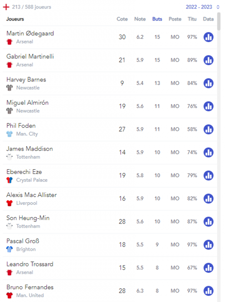 Milieux buteurs en Premier League sur la saison 2022-2023